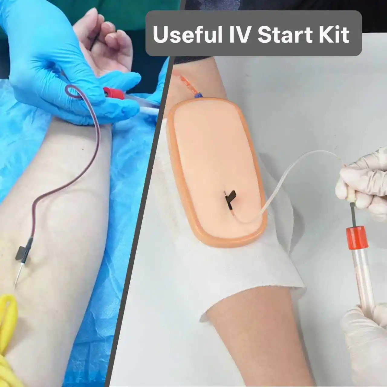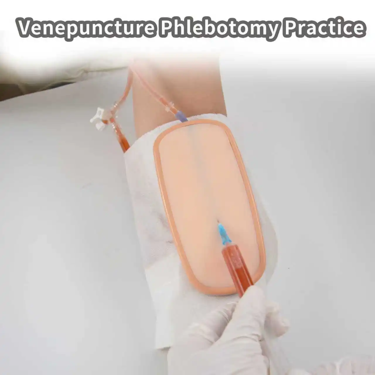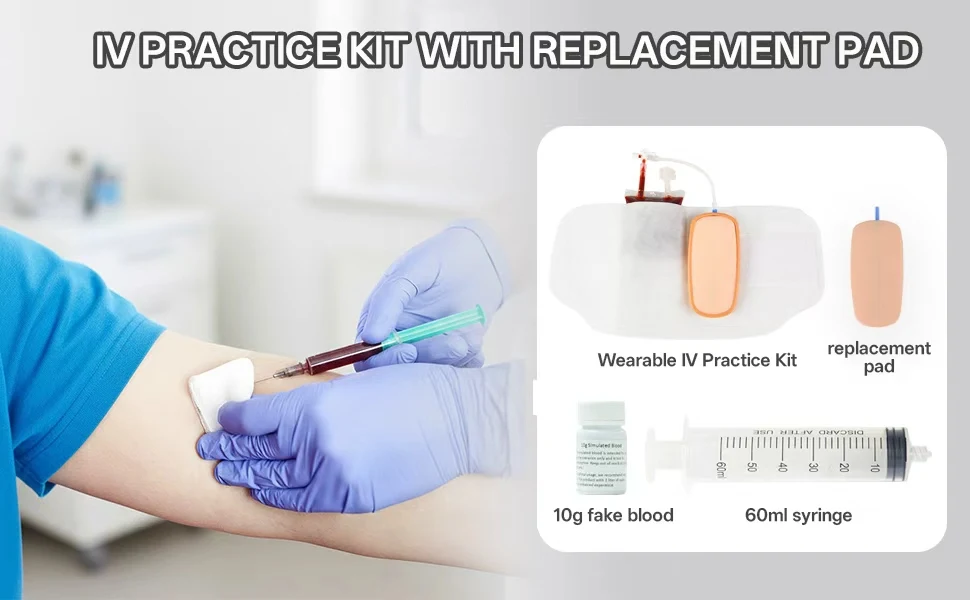 This complete phlebotomy practice kit includes an IV training pad with base, wearable arm sleeve, syringes, replacement pad, fluid bag, blood simulants, and essential accessories for comprehensive IV training. It features a replaceable injection pad design and a wearable arm sleeve, with a hard base under the soft injection pad to ensure safe practice.