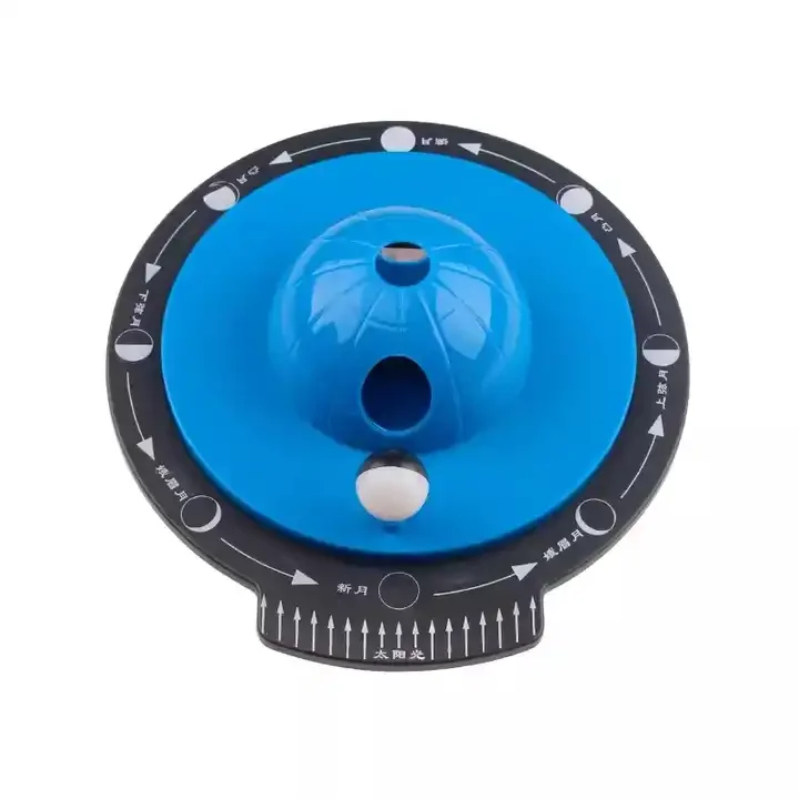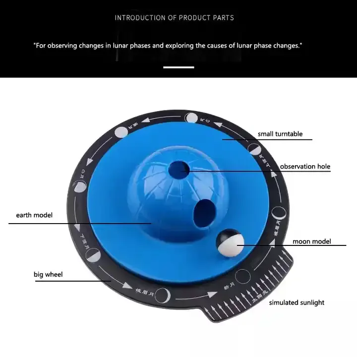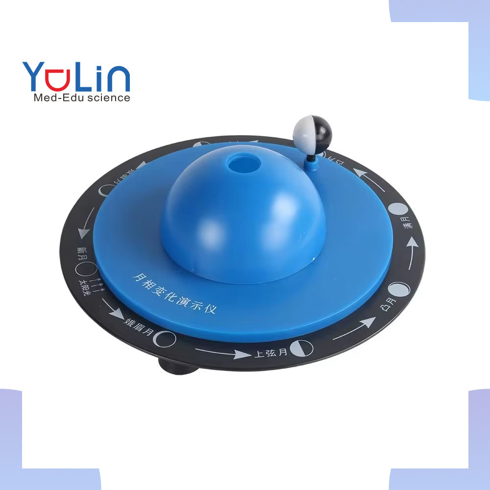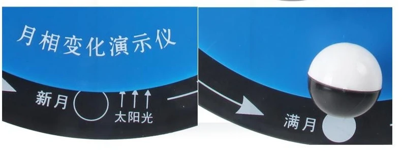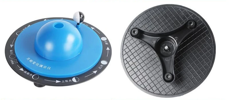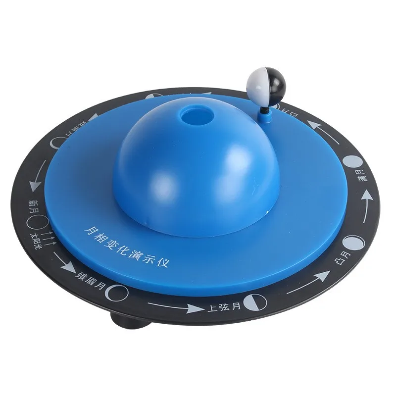 The moon phase demonstration instrument is composed of earth model, moon model, gear, size turntable and base. Through the black and white side of the moon model to simulate the light and dark side caused by sunlight on the moon, turn the small turntable counterclockwise, the moon model will rotate around the Earth model, and at the same time, driven by the gear, the moon model will produce rotation, simulating the moon phase at different times.