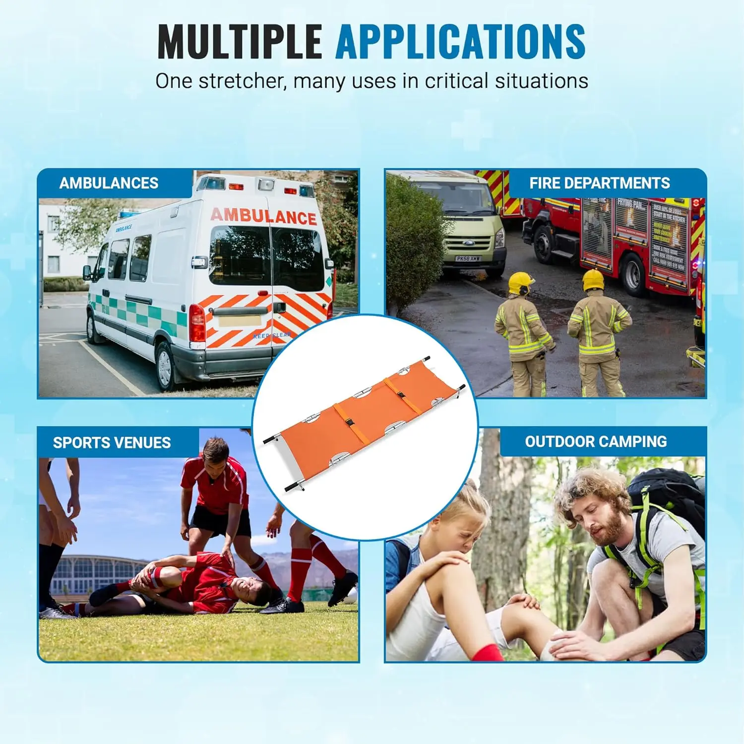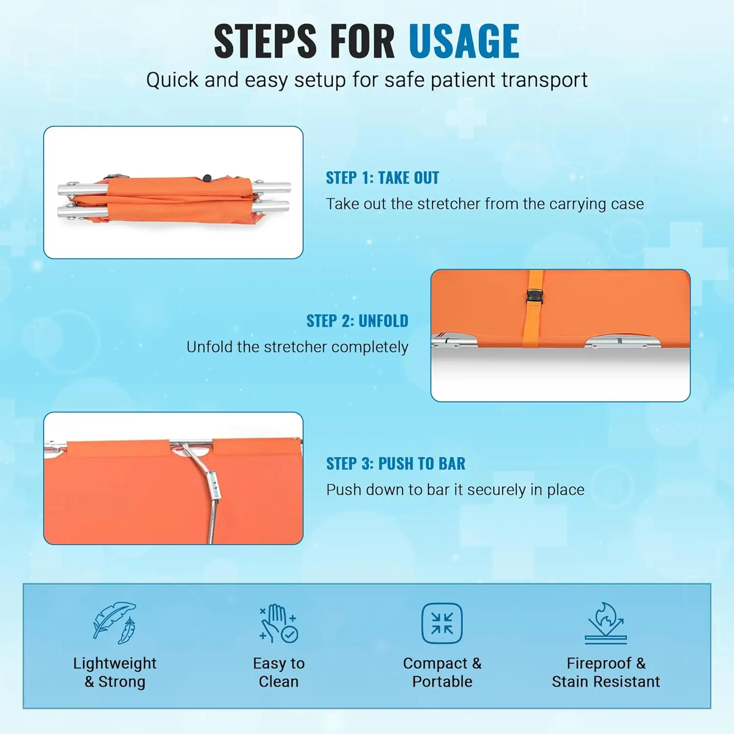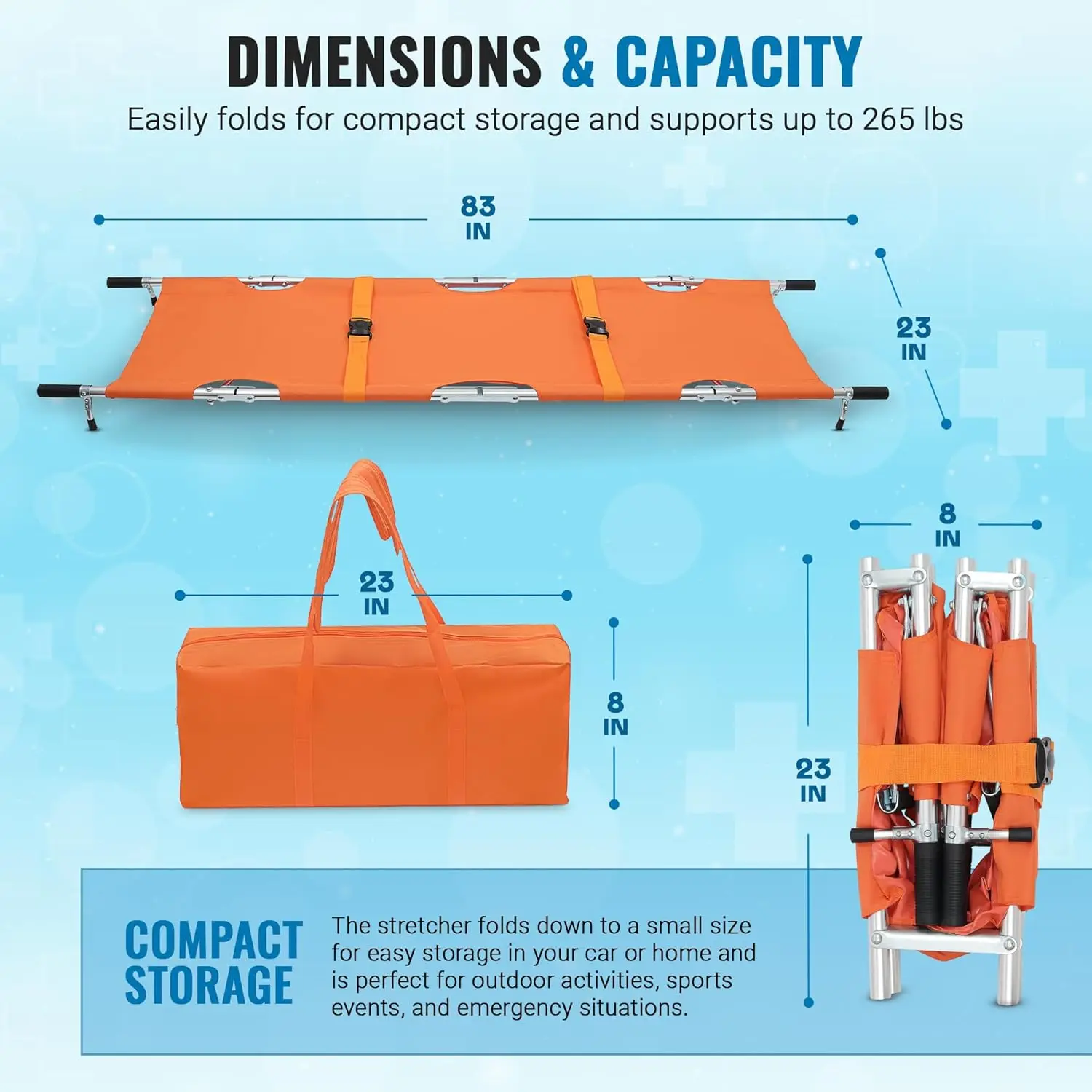STRONG AND DURABLE DESIGN. This stretcher is made with high strength aluminum alloy and reinforced withtwo steel bars, making it both lightweight and sturdy. This camping essential medical kit can support up to heavyweightensuring safety and reliability during emergencies.
