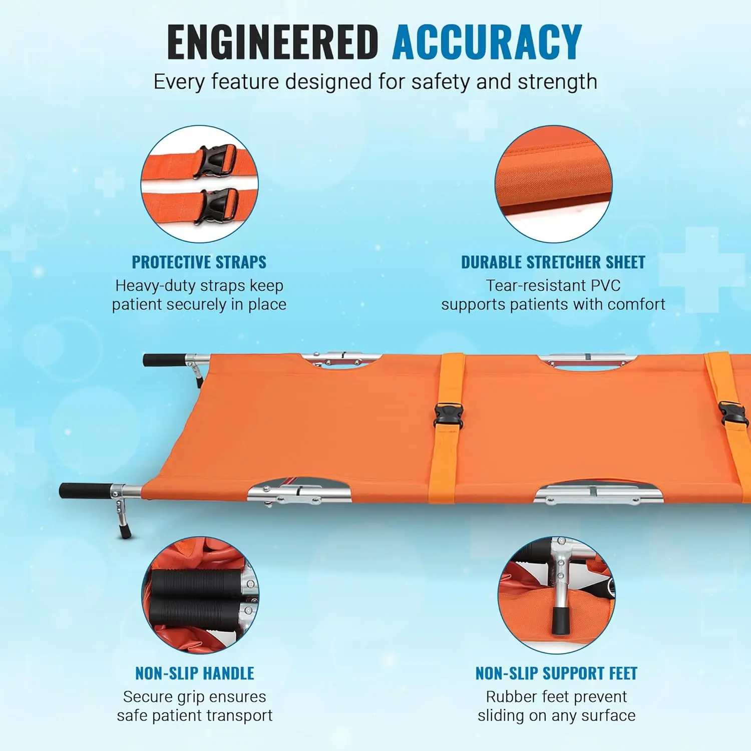 SAFE AND SECURE. Designed with rubber handles and leg supports, this foldable and portable medical stretcherensures the patient stays stable and secure during transport, providing added safety and comfort.