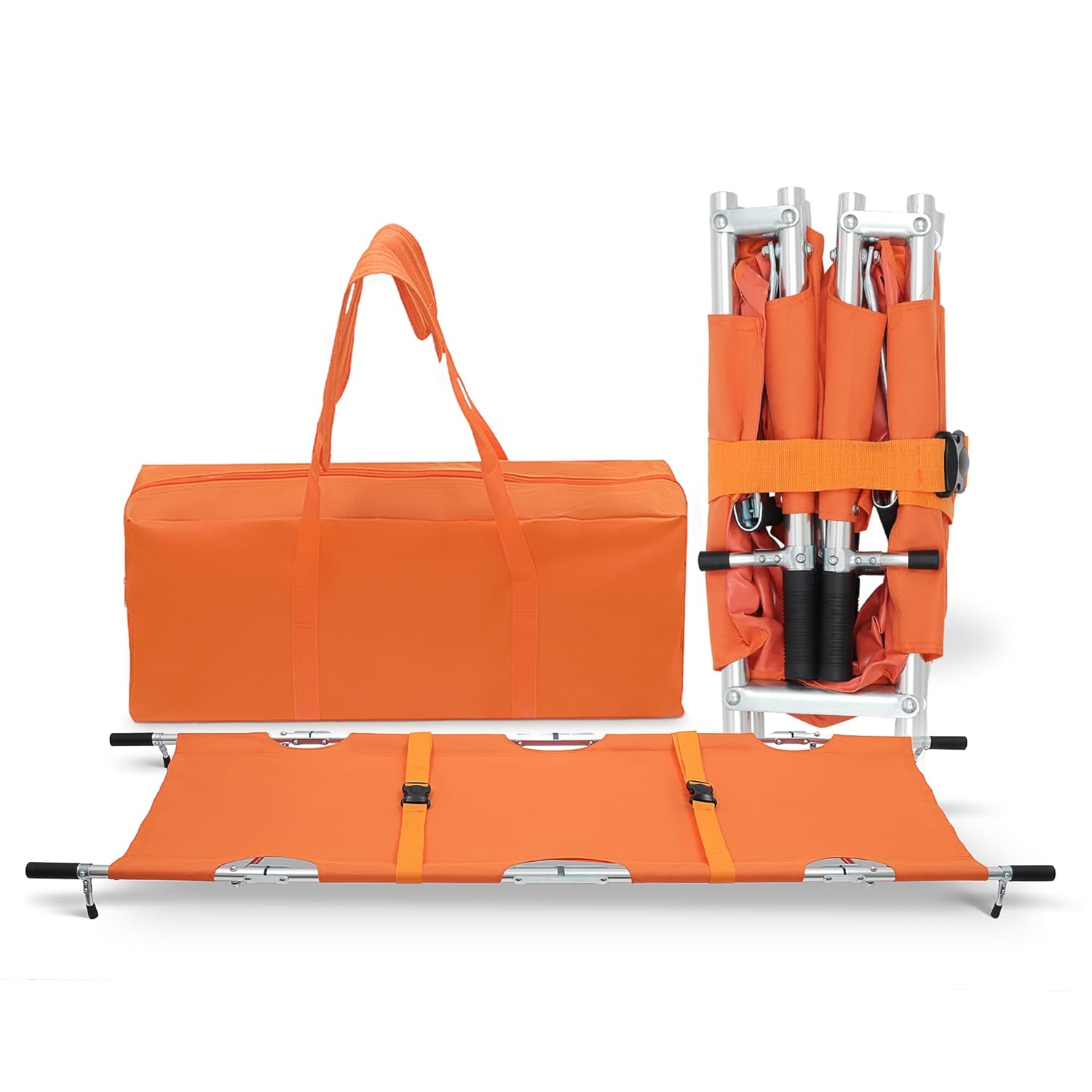 STRONG AND DURABLE DESIGN. This stretcher is made with high strength aluminum alloy and reinforced withtwo steel bars, making it both lightweight and sturdy. This camping essential medical kit can support up to heavyweightensuring safety and reliability during emergencies.