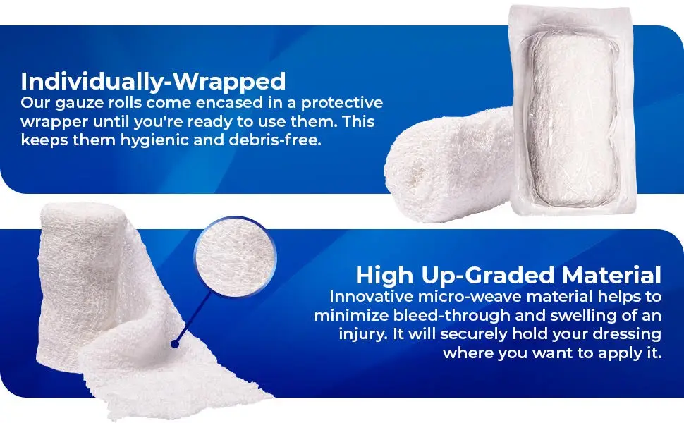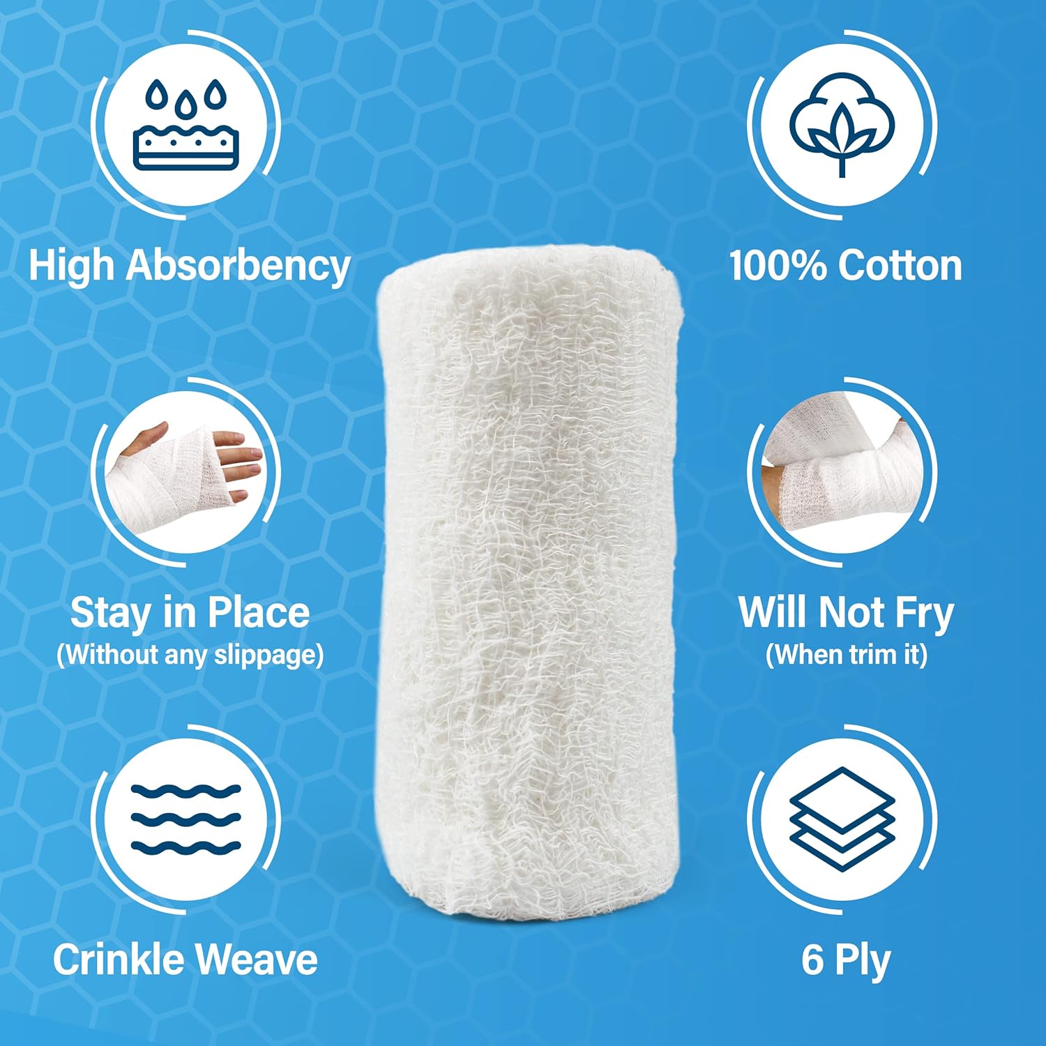 PERFECT FOR PRIMARY AND SECONDARY WOUND CARE DRESSING. This bandage wrap features a 6-ply crimped cotton cushion and an open weave fabric that provides perfect absorbency and aeration when applied into the wound, and a highly comfortable feel for a secondary dressing, helps keep the primary in place, and provides extra cushion to improve protection HIGH QUALITY GAUZE ROLL – This gauze wrap is made of 100% pure cotton, and is latex free. This makes it the go to option for physicians for dressing wounds. Cotton is one of the most absorbent elements in nature. Your wound will be dressed for a smooth process Highly Absorbent Sterile Wound Dressing- More absorbency then standard conforming bandage – Care for wounds safely and effectively. Our sterile cotton gauze bandage is ideal for scrapes, cuts, burns, stitches and surgical sites. This gauze roll is suitable for serious and minor wounds. 6 Ply Crinkle Weave Fabric for Excellent Absorbency – Our stretchy gauze wrap is made with open weave fabric for excellent absorbency and aeration. More absorbency then standard conforming bandage. Safely bandage, wrap and dress wounds with this medical grade sterile gauze. Latex Free, Hospital Grade Medical Gauze – Gauze bandage rolls are clean, sterile and safe to use on wounds. This gauze bandage roll is non-toxic and latex free. Our surgical cotton roll is suitable for hospital and clinical, and home use.