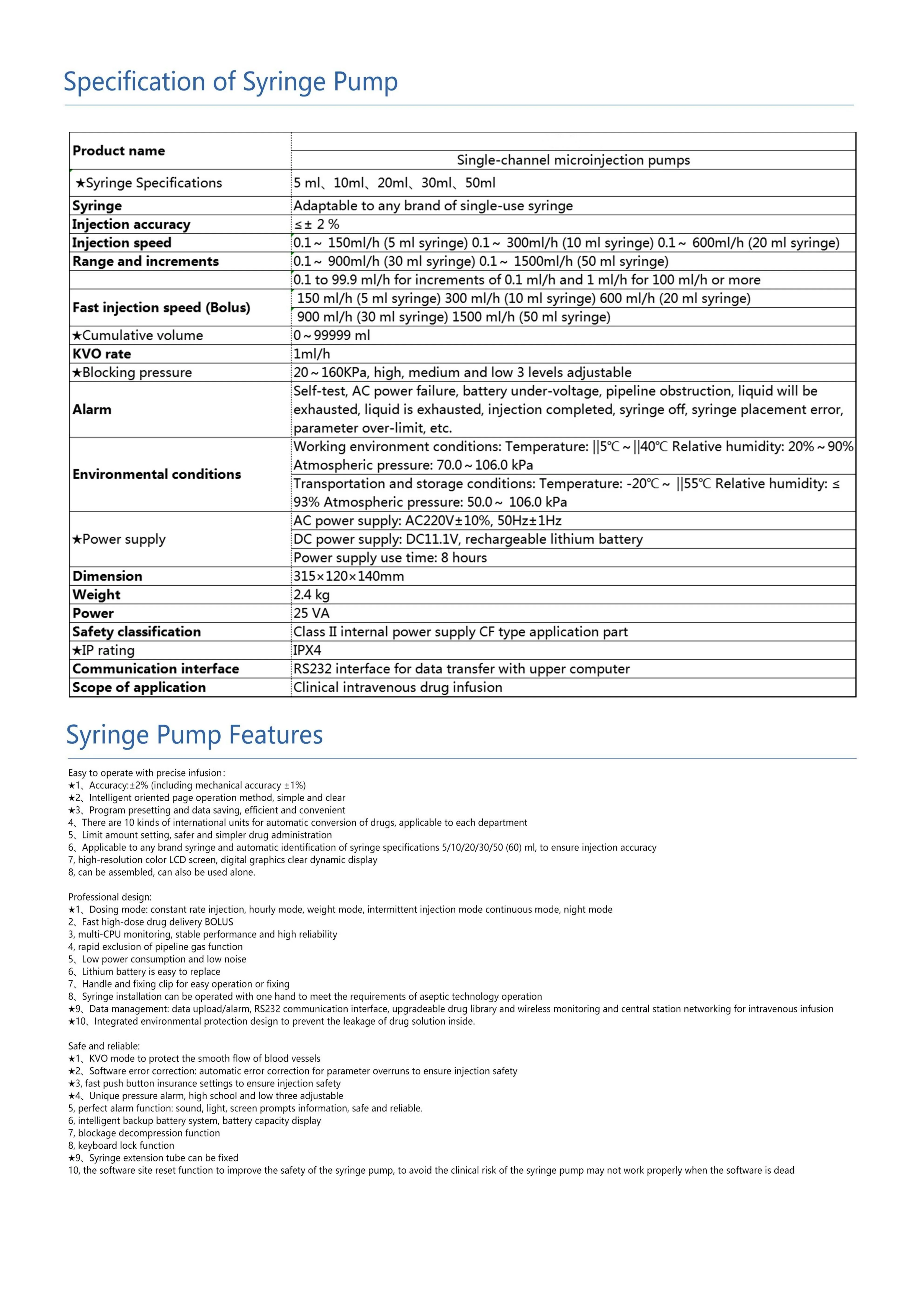 Portable Syringe Pump Main Features: