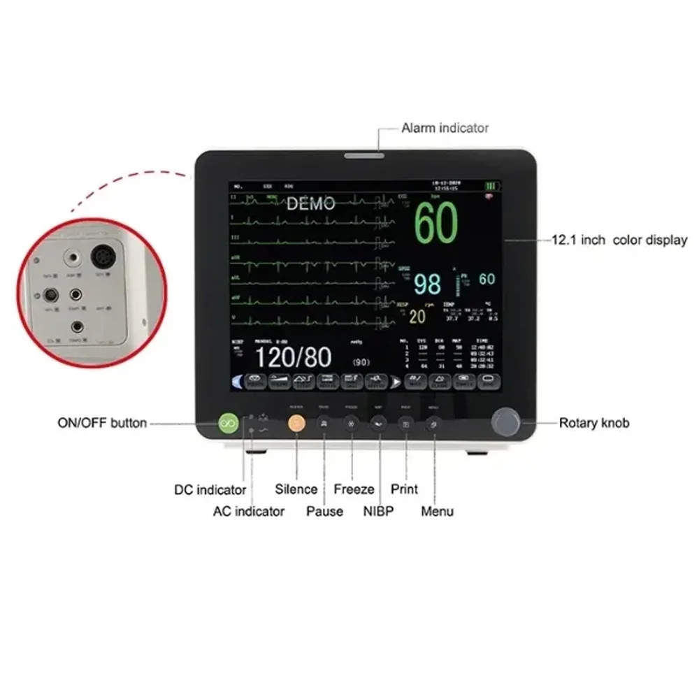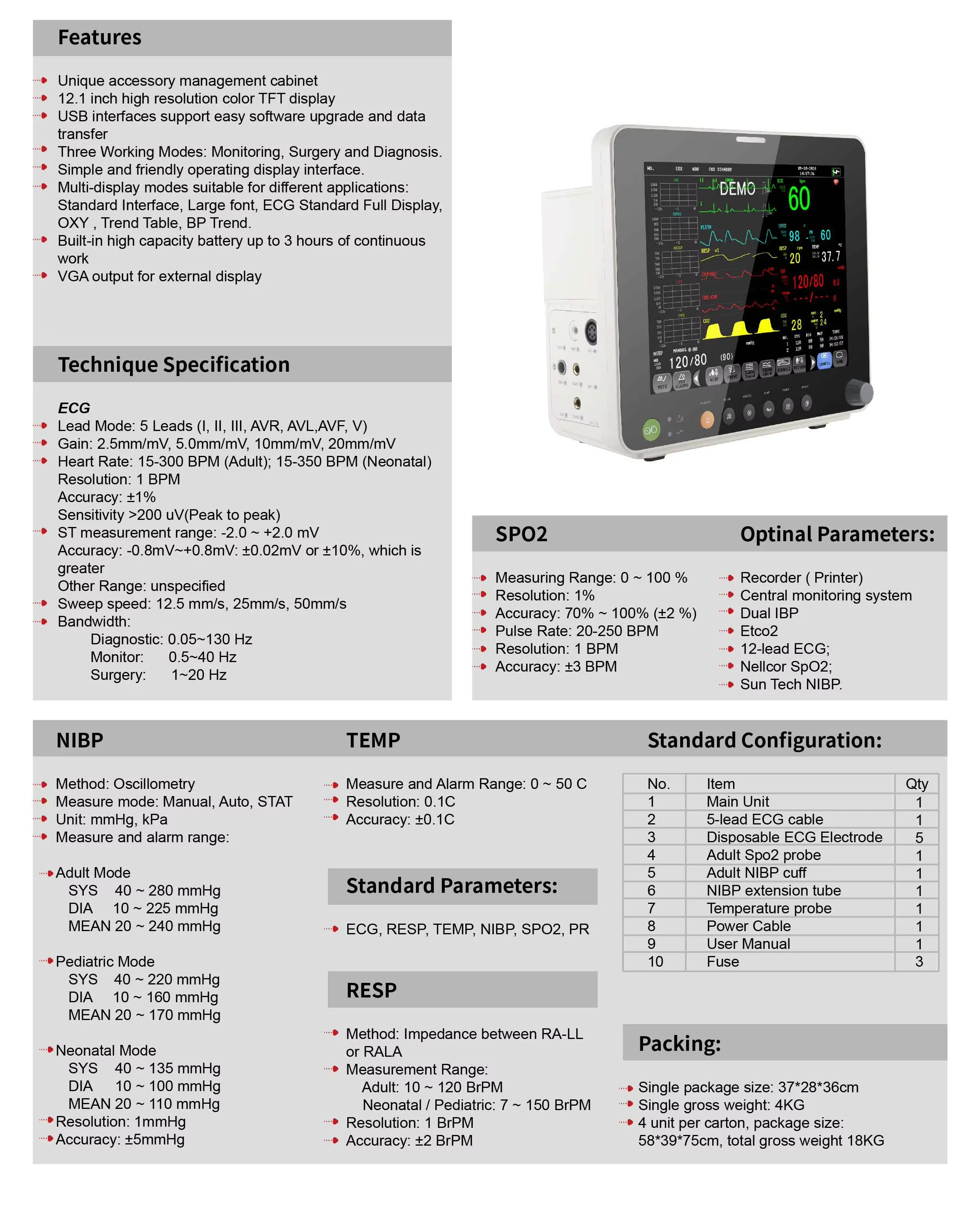 Standard Interface, Large font, ECG Standard Full Display, OXY , Trend Table, BP Trend.