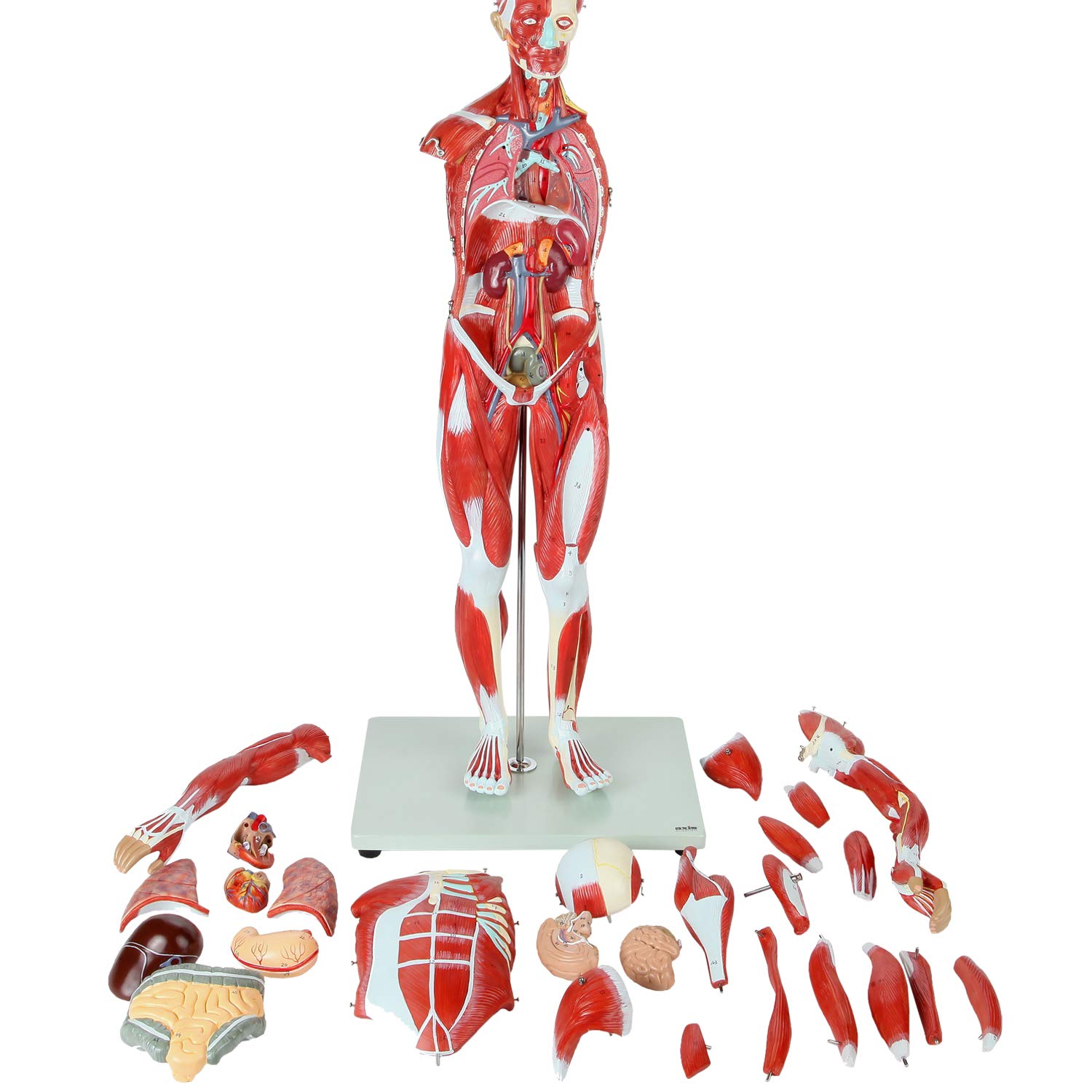 HUMAN MUSCLES AND ORGANS FIGURE: The Human Muscles and Organs model features 27 removable parts that are held on by metal screws, posts, and hooks. It displays the muscular system with numbered parts that comes with a corresponding key. It has removable arms, a removable calvarium with two-part brain, and a removable chest plate that hides the individual numbered organs of the digestive system.