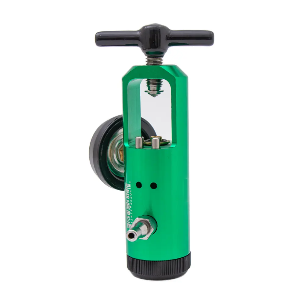 * This oxygen regulator for home use is made of lightweight anodized aluminum with brass high pressure conduits, ensuring durability and dependability.